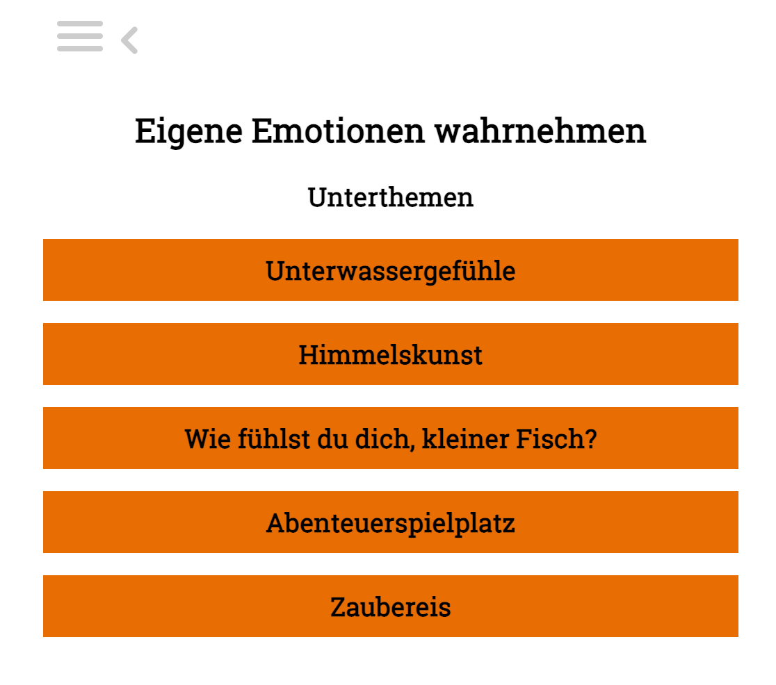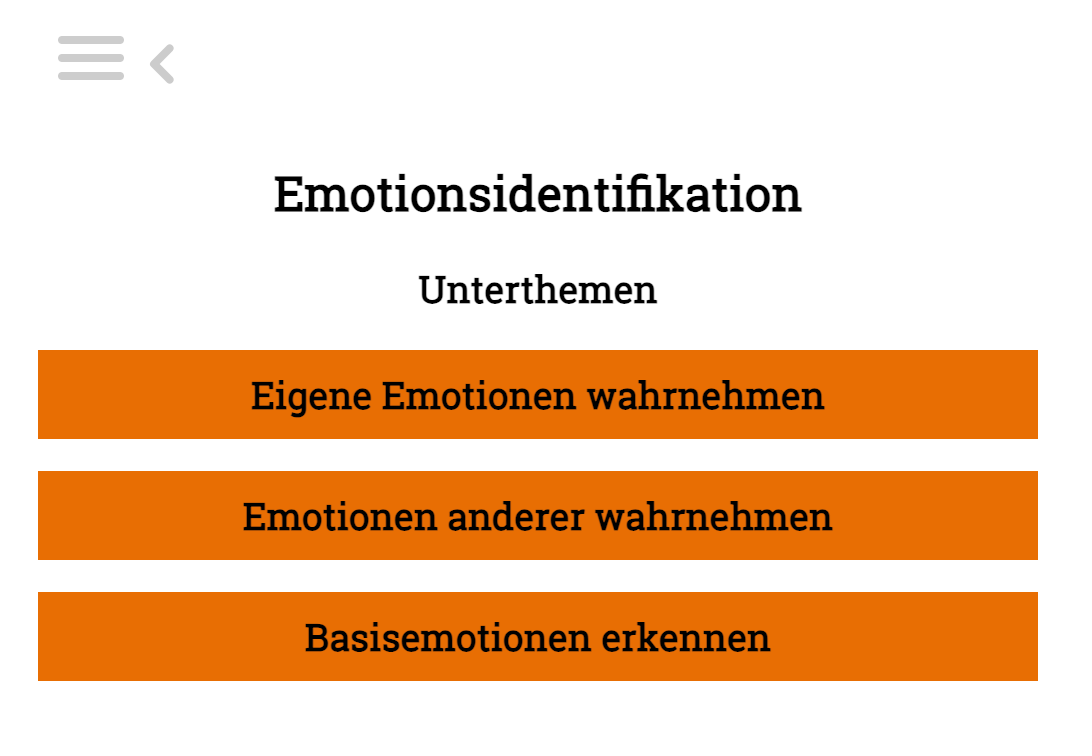 Mit Klick auf eines der Themen kommst du auf die entsprechende Themen-Seite. Wir veranschaulichen das im Folgenden anhand des Beispiels „Emotionsidentifikation”.