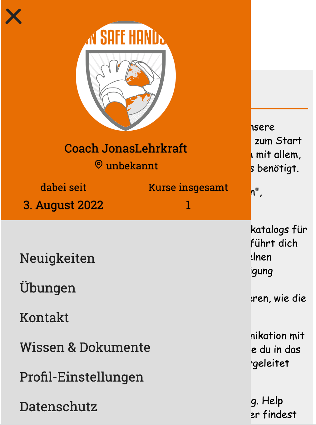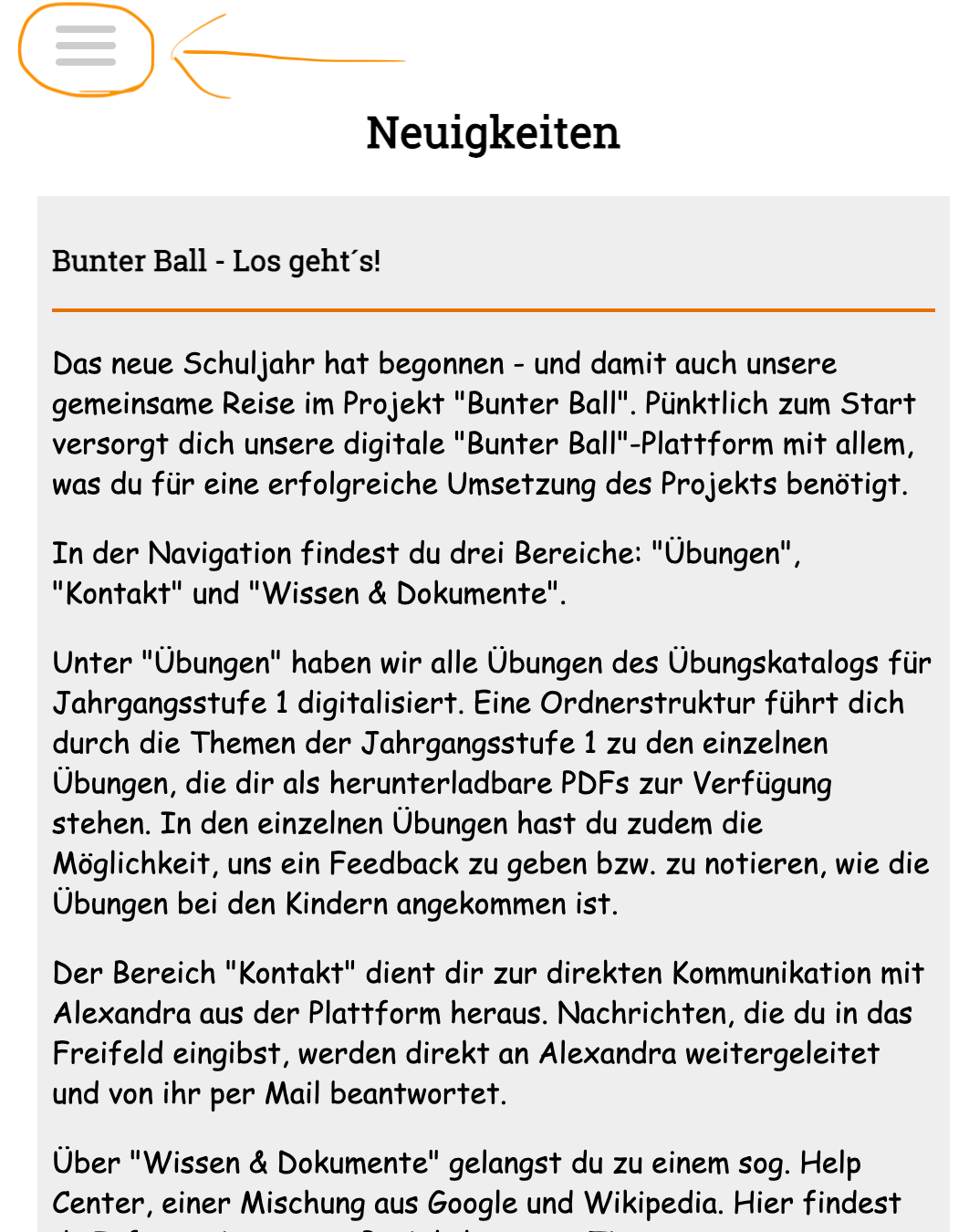 Nachdem du dich erstmalig auf http://bunterball.de eingeloggt hast, landest du auf unserer Startseite, auf der du zukünftig von News begrüßt wirst. Oben links in der Ecke findest du drei waagerechte Striche, das sog. „Burger”-Menü. Klickst du das „Burger”-Menü an, öffnet sich auf der linken Seite ein orange-grau hinterlegtes Menü mit verschiedenen Absprungpunkten: