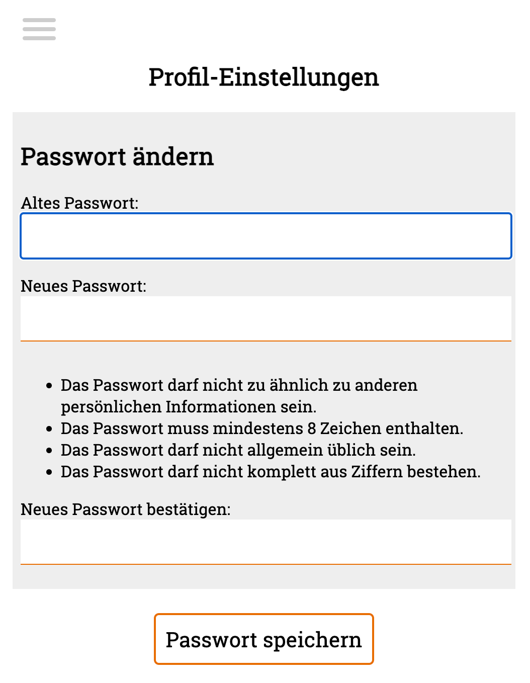 Um dein Passwort zu ändern, klickst du im Menü auf den Punkt „Profil-Einstellungen”. Du gelangst dann zu der folgenden Seite: